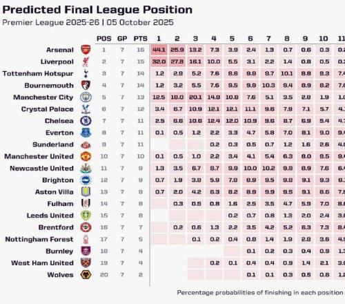 雷速体育10月6日宣 25/26赛季英超第7轮比赛悉数战罢,根据本轮赛果,国外数据机构超级计算机再次更新了本赛季英超的预测排名,其中阿森纳以44.1%的夺冠概率反超利物浦,升至第一。
