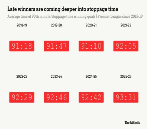 这一变化将决定性的时刻推得更晚。本赛季补时进球的平均时间出现在第93分31秒,这是过去八个英超赛季中最晚的一次。