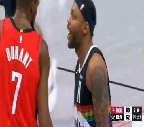 没想到,杜兰特与布鲁斯·布朗在比赛中发生激烈口角,事件发生在12月21日火箭对阵掘金的比赛中,起因是布鲁斯-布朗得分后主动挑衅杜兰特,随后双方对喷垃圾话,穆雷也卷入进来和杜兰特对喷。