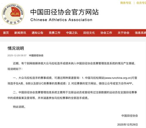 近期,有个别网络媒体就大众马拉松选手成绩未纳入中国田径协会竞赛管理信息系统的情况产生猜疑,现说明如下: