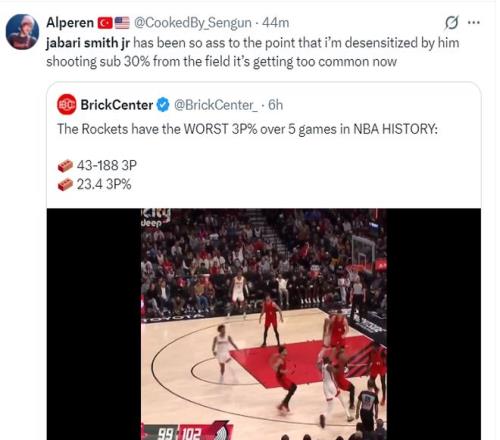 美媒写道过去五场比赛,火箭三分球188中43,三分命中率23.4%是历史最低,火箭球迷转推后写道:小贾的表现太糟糕了,以至于他投出30%的命中率我都习以为常,这种情况已经屡见不鲜。