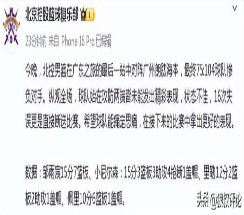 北控男篮在广东之旅的最后一站中对阵广州朗肽海本,最终75:104球队惨负对手。纵观全场,球队始终在攻防两端皆未能发出精彩表现,状态不佳,16次失误更是直接断送比赛。希望球队能痛定思痛,在接下来的比赛中拿出更好的表现。
