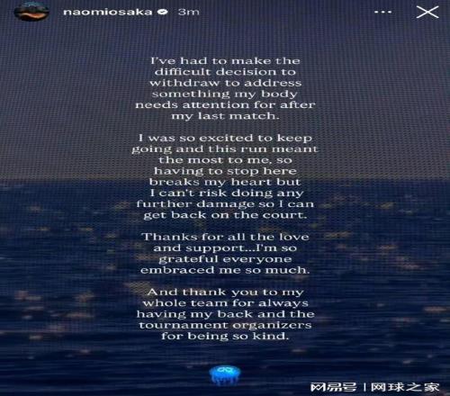 大坂直美在退赛声明中表示,这一决定是基于身体状况的考量:“经过艰难的考量,我不得不做出退赛的决定,以便在上一场比赛后,给我的身体一些急需的关注。”