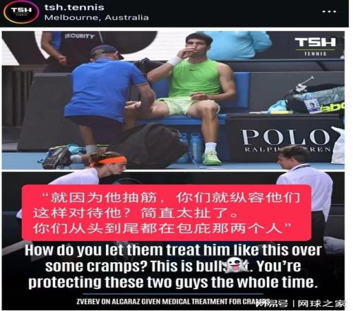 这场比赛耗时5小时27分钟,被认为是一场足以载入澳网史册的史诗级比赛之一。不过,这场比赛也出现了一个巨大的争议,在第三盘盘末阶段,阿尔卡拉斯右大腿出现不适,申请医疗暂停。